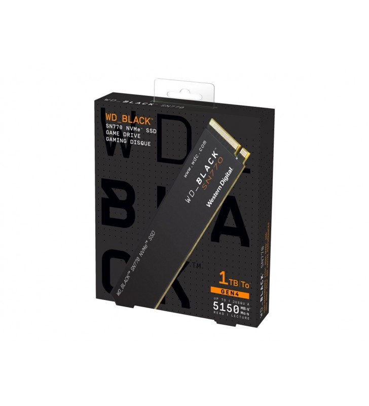 Disque mémoire SSD format M.2-2280 NVMe PCIe Gen4 x4 - Black SN770 de Western Digital 3D Nand - 1 To - Carte électronique - Vitesse lecture - écriture : 5150 Mo/s - 4900 Mo/s - Lecture/Écriture aléatoire 4K : 740000 / 800000 IOPS - Garantie 1 an par Info Gamma en échange standard + 4 ans par le constructeur.